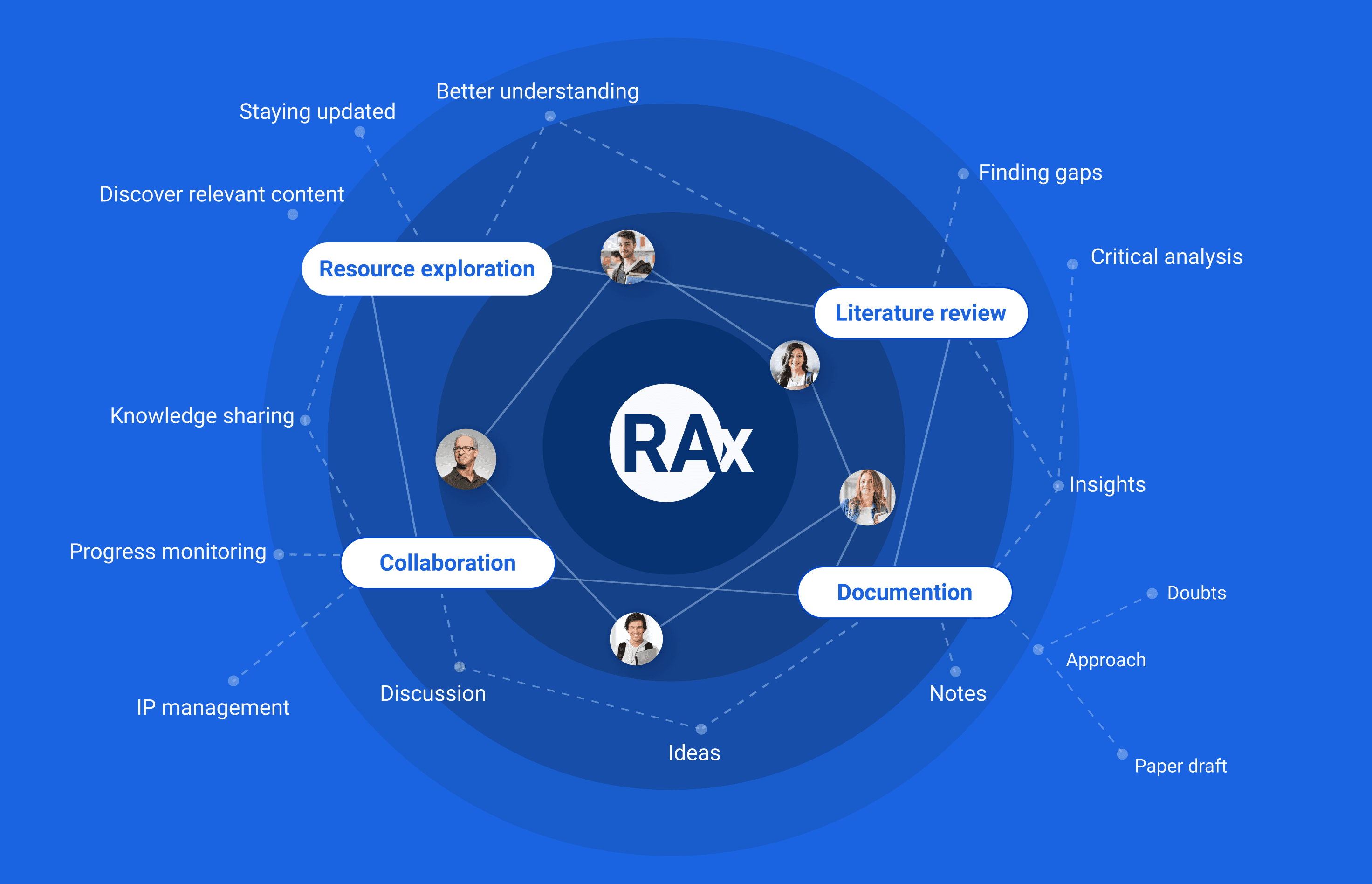 RAx is a web app that assists research scholars to speed up their information discovery, improve understanding of scholarly articles and organize knowledge to be more productive.